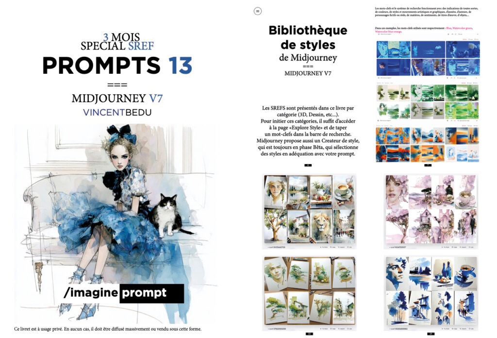 Voici ma série de livres « PROMPTS » sur Midjourney, dédiée à la communauté française, qui sont une synthèse des réalisations affichées sur les réseaux sociaux et Discord depuis 2023. À télécharger en cliquant sur l’image dédiée. Certains livres anciens sont déclinés en 2 PDF pour PC ( avec ou sans double page – images HD) et smartphone ( 1 page – images 144 ppp).