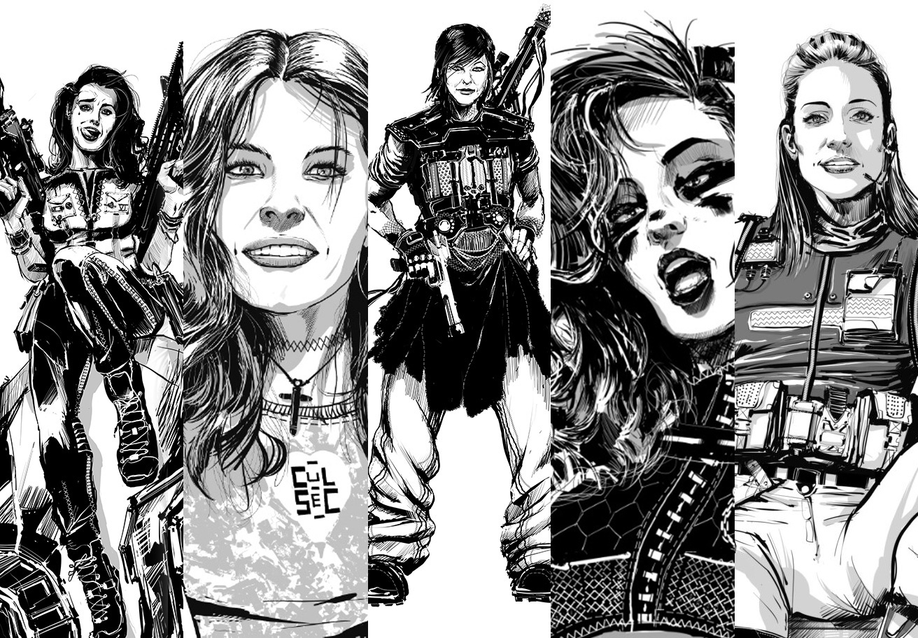Série de croquis. Portraits de femmes équipées d’armes futuristes, prénommées par ordre alphabétique.